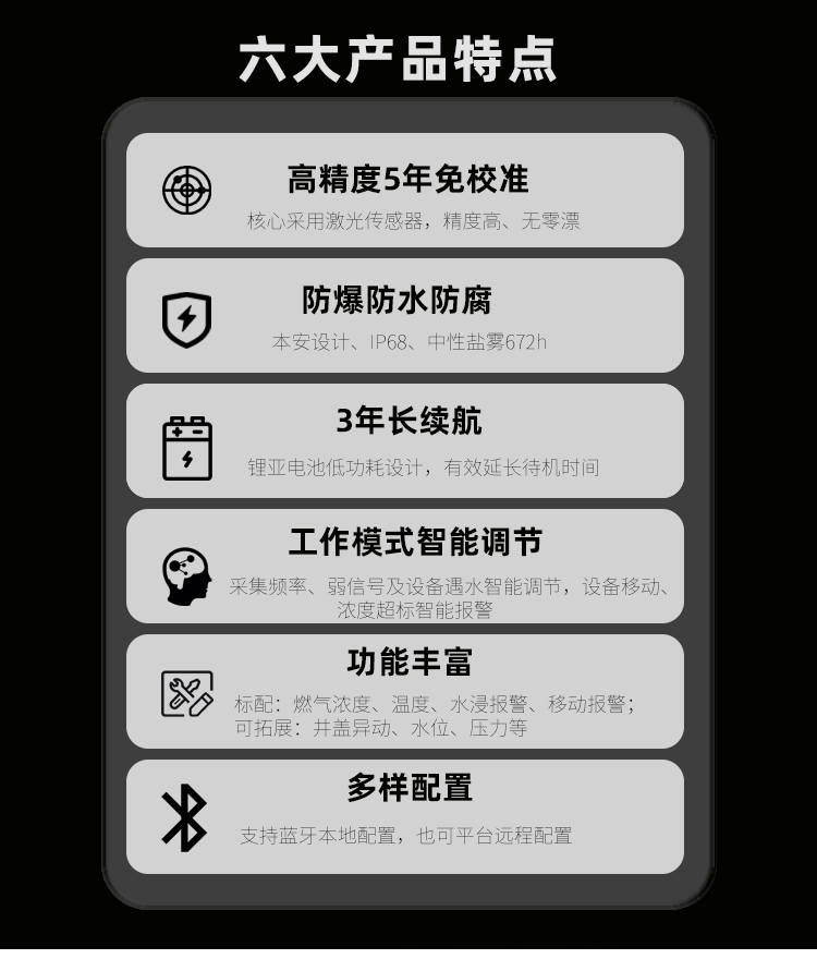 本产品尤其适合于窨井、燃气输配管网上方等施工布线困难、无人值守的地方。它不仅为城市地下管线的安全运行给予了强有力的技术支撑,更是城市智慧化管理不可或缺的一部分。